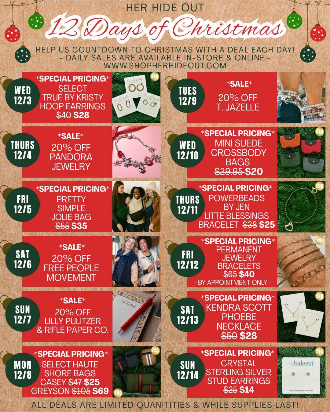 Join us each day for a new sale! Each sale is only valid for 1 day only, while supplies last. Not valid on previous purchases.